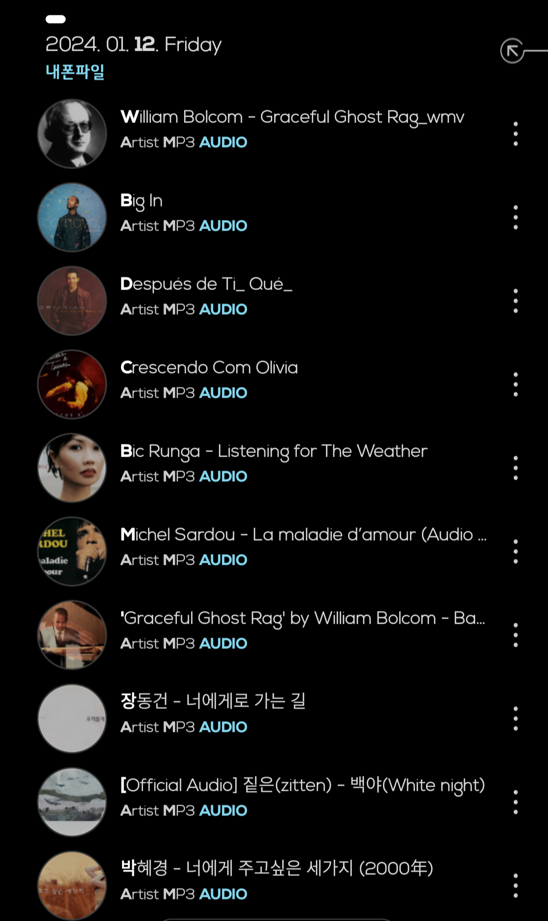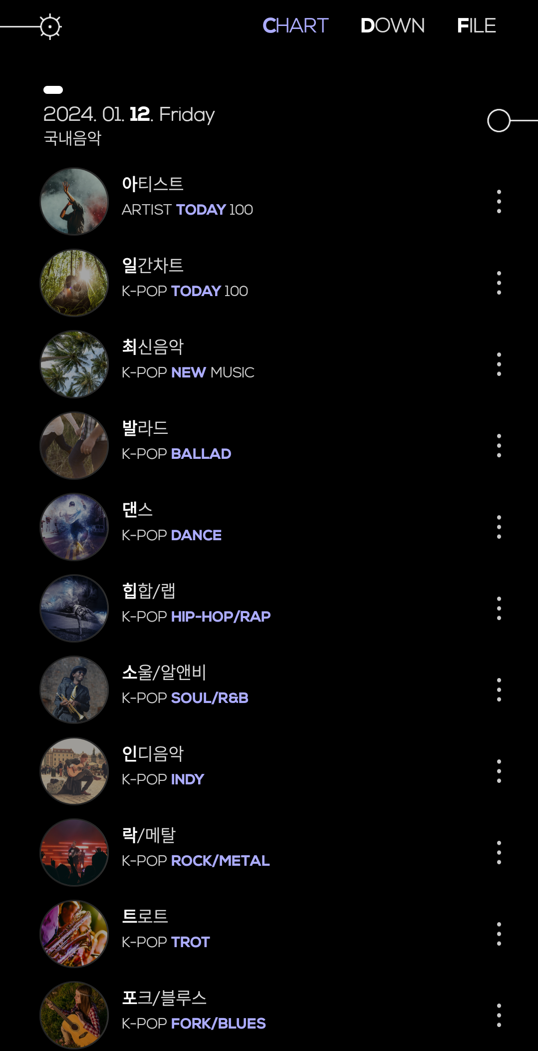 먼저 이 앱을 실행하면 국내 음악들이 뜨는데요,