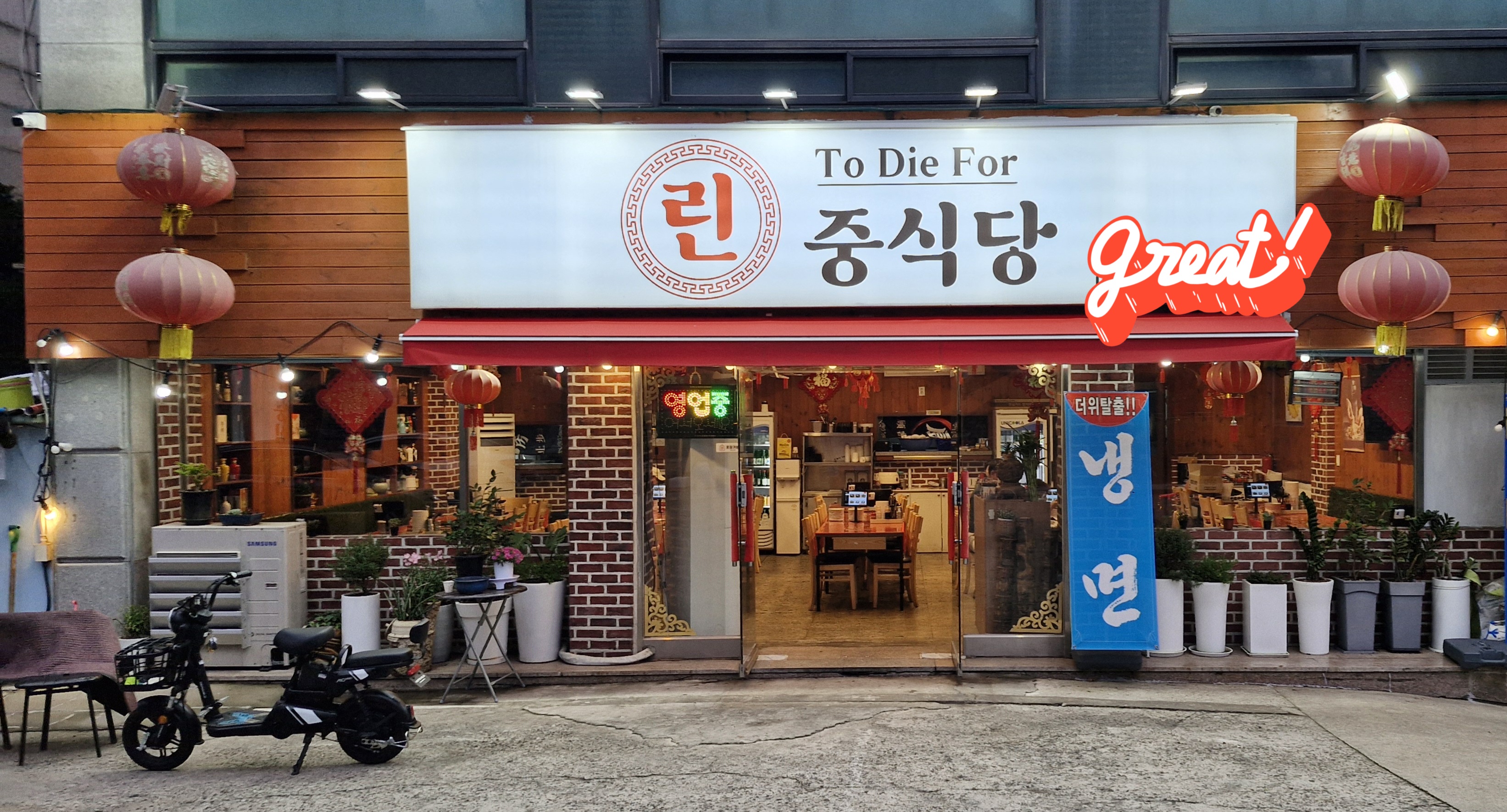 간판 주변을 중국식 연등으로 장식을 해 놓은 게 인상적이다.