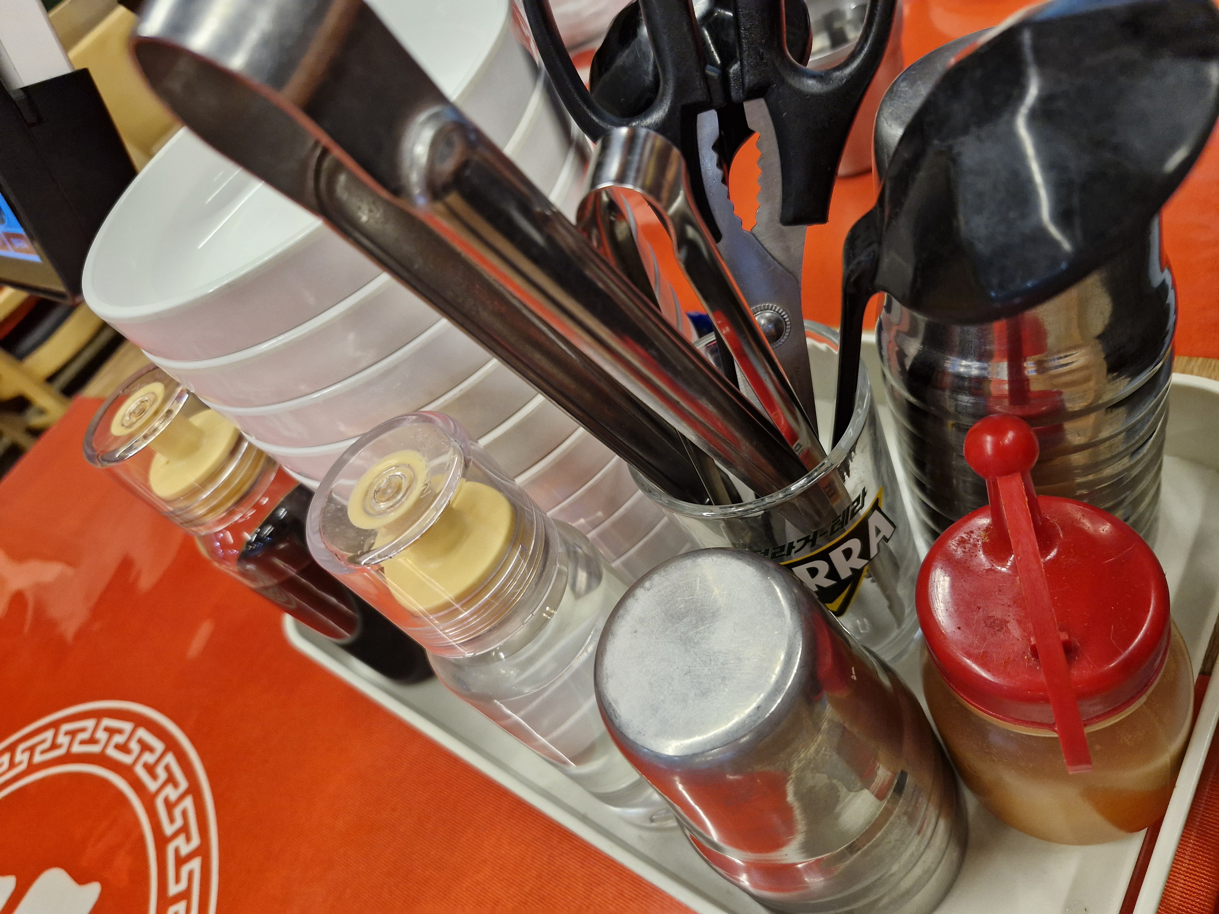 터치스크린 옆에 있는 각종 소스, 앞접시, 물컵, 물통, 집게와 가위.