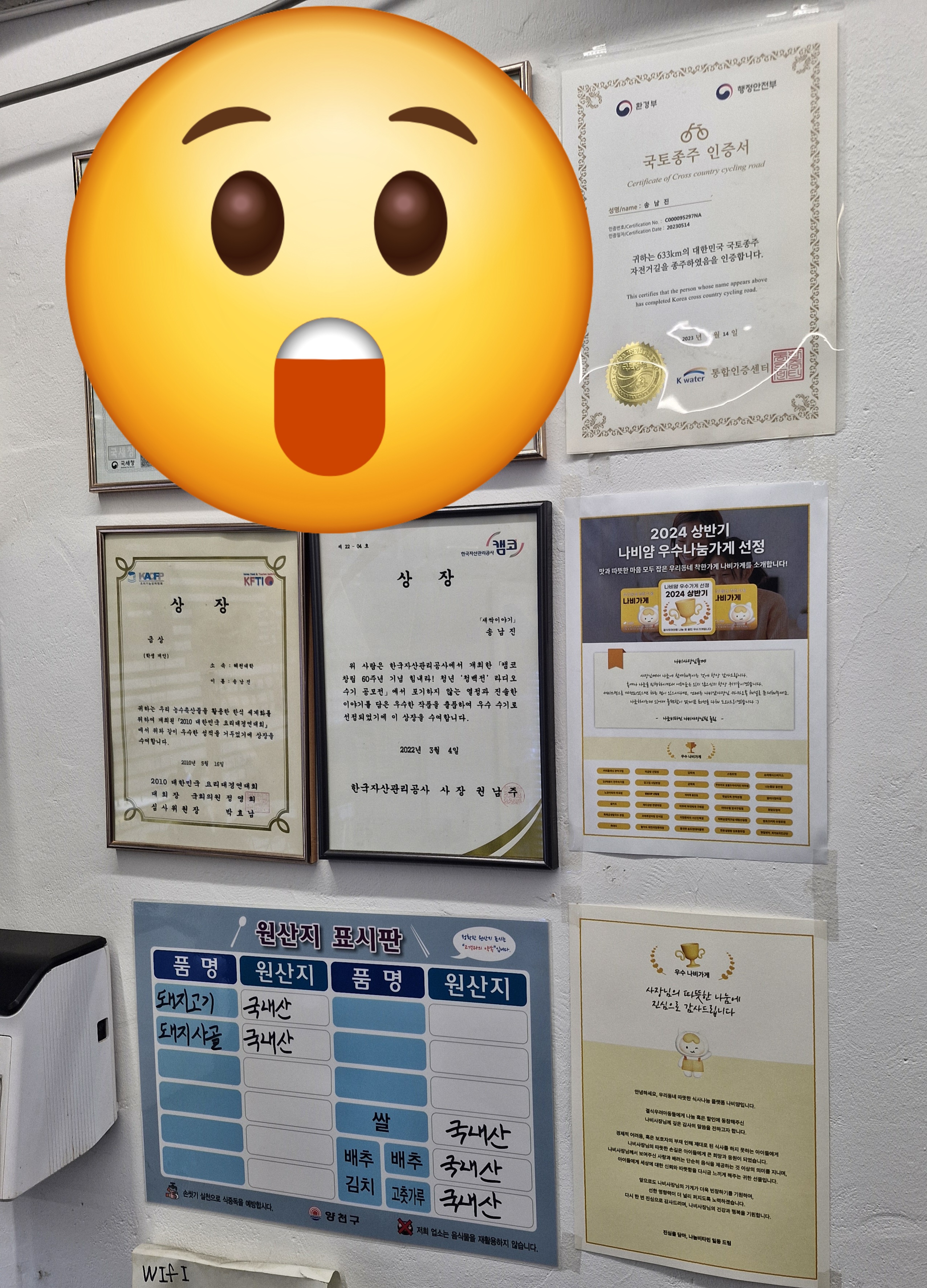 원산지 정보 표시판과 사장님의 수많은 상들.
