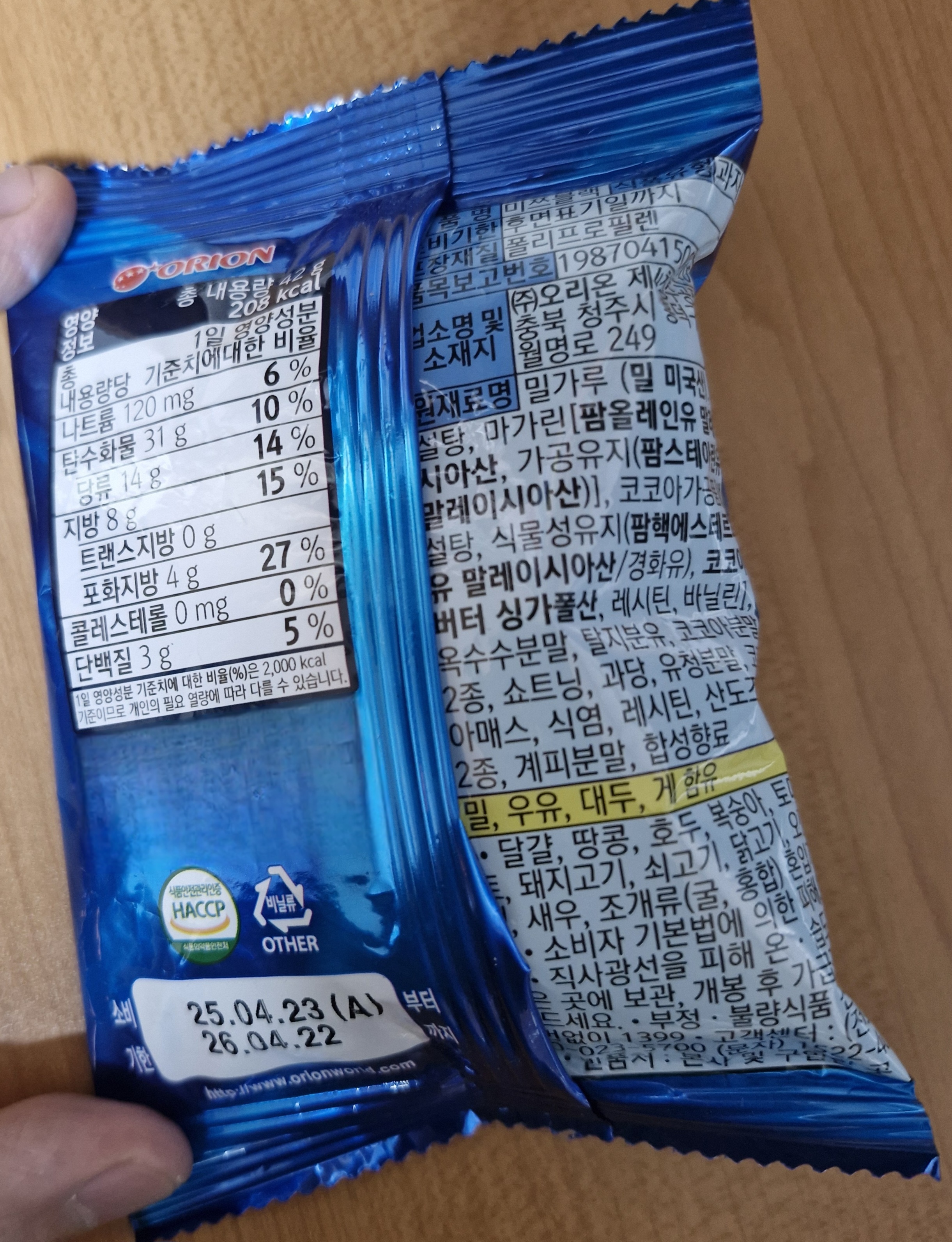 뒷면에 자세하게 표시된 영양정보와 원재료명 정보.