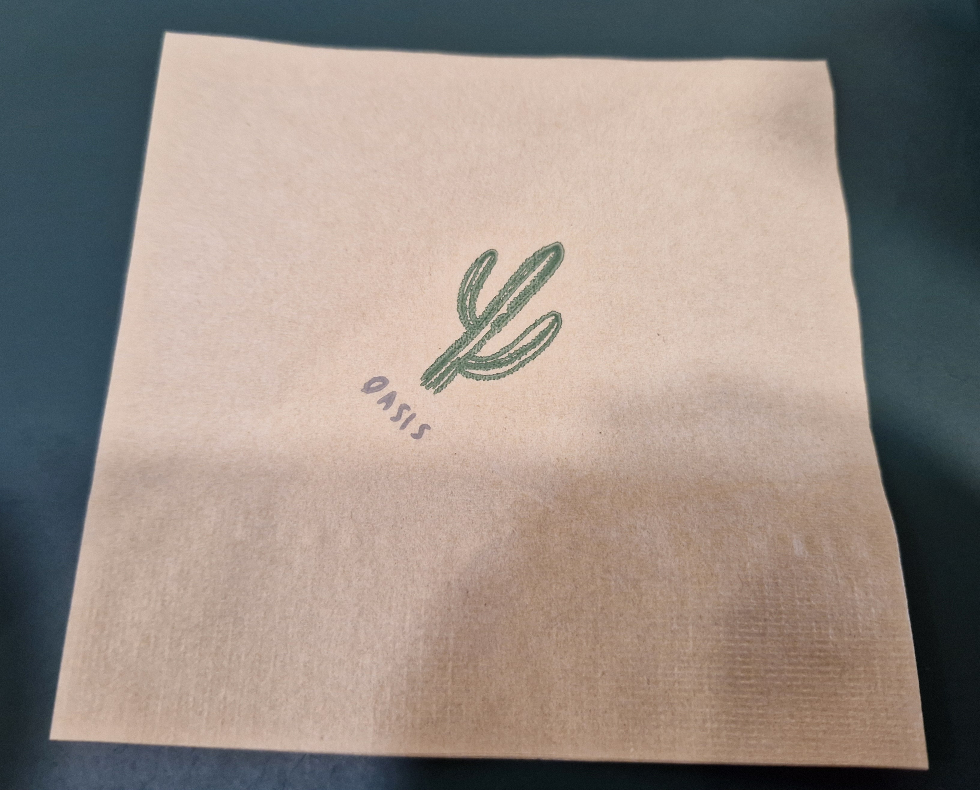 냅킨에는 선인장 그림이 그려져 있고, 그 아래에 "Oasis"라는 글자가 쓰여있다.