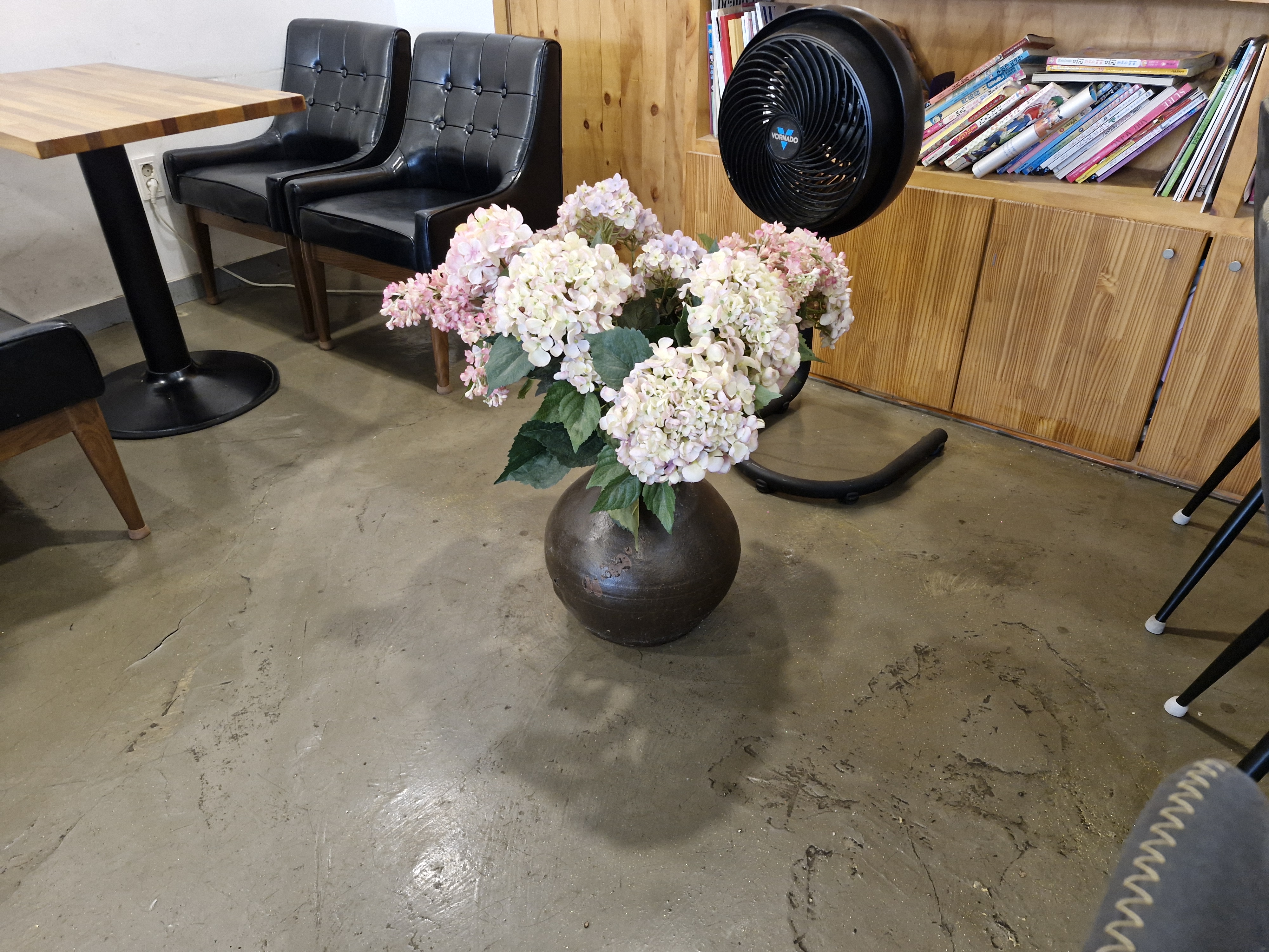 여름이라서 예쁜 꽃병 뒤에 선풍기를 설치해 놓은 모습.