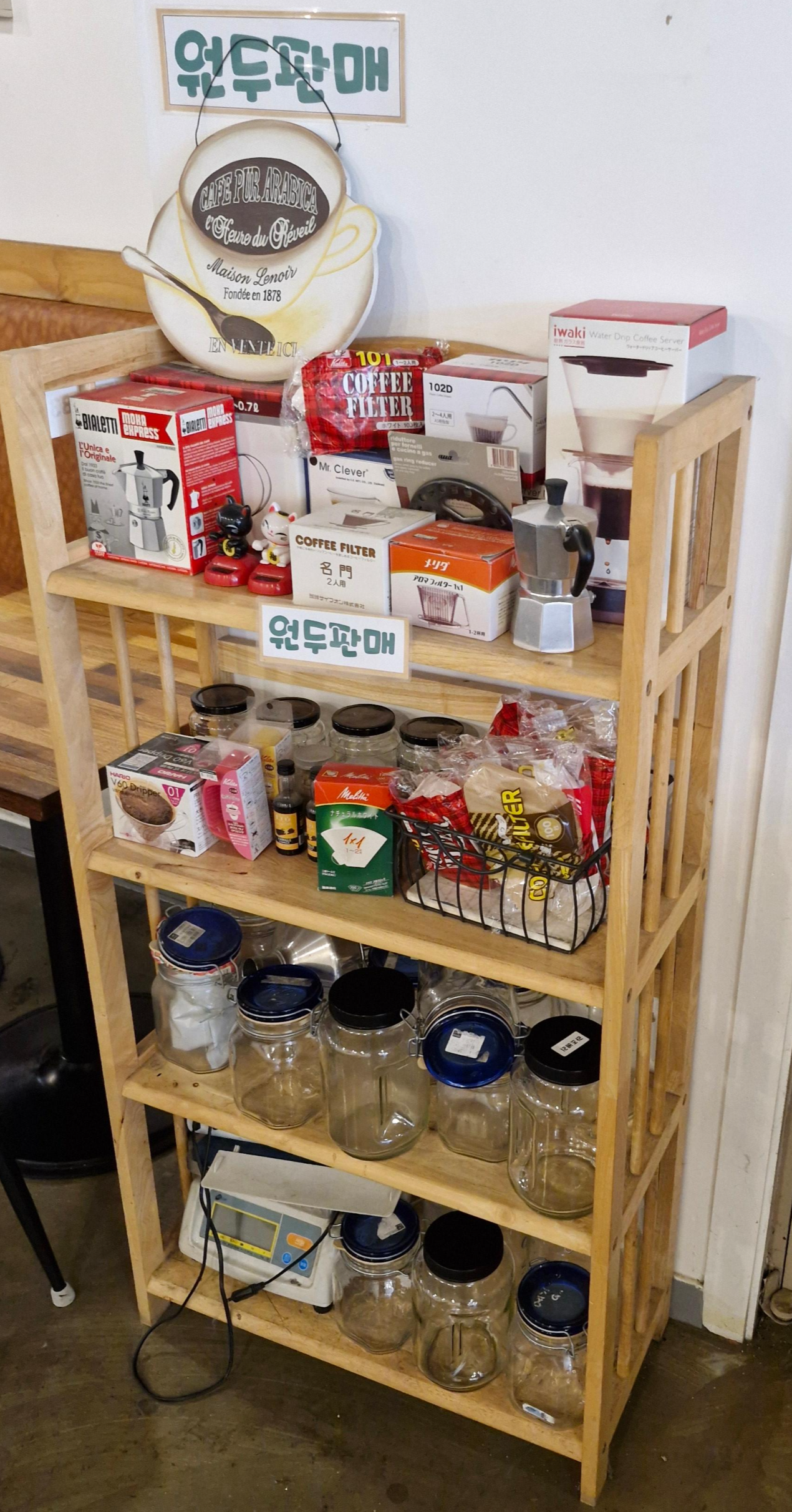 계산대 옆에 진열해 놓은 커피전용 도구들.