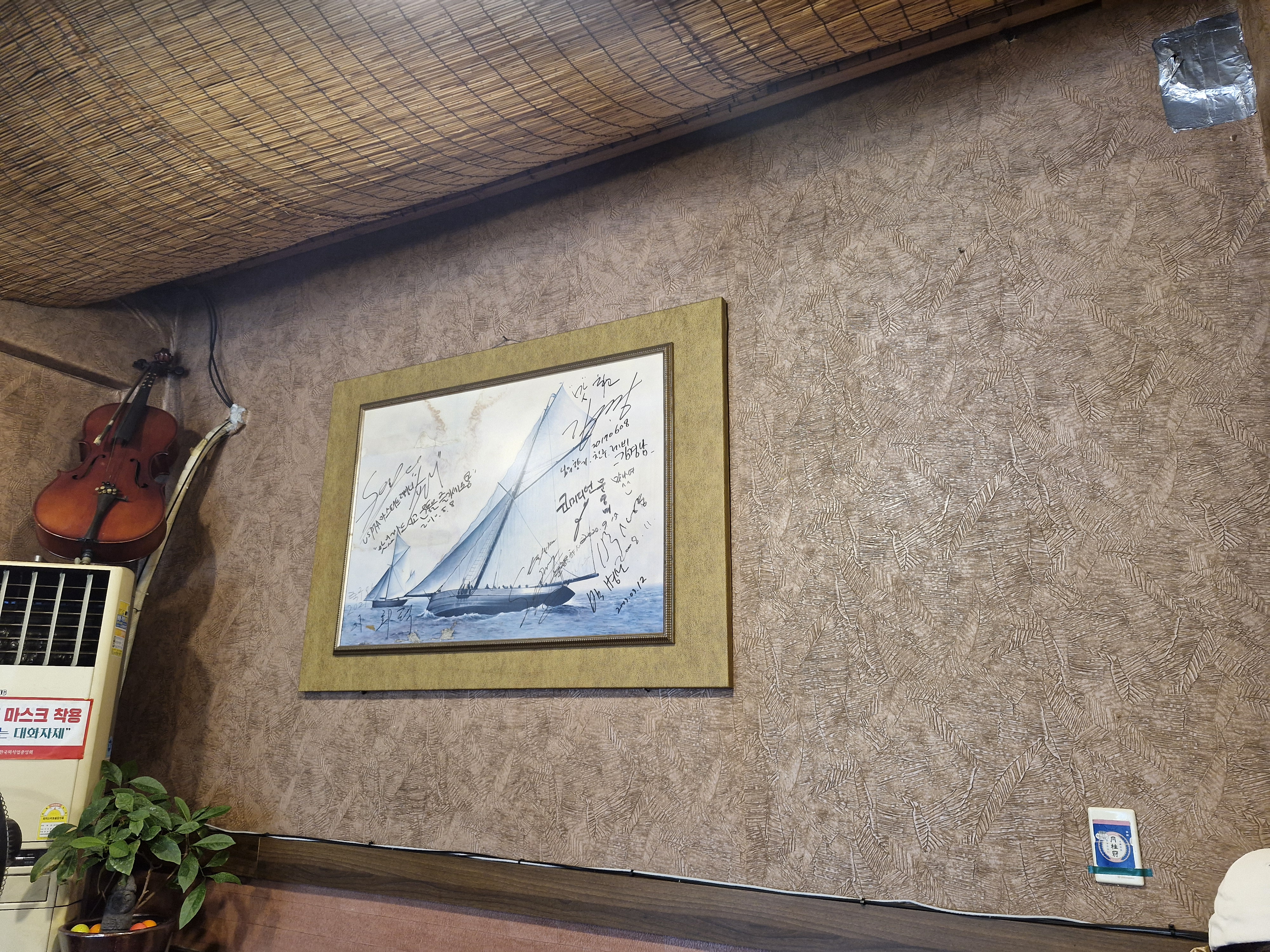 식당 벽에 걸려있는 배 그림에는 각종 유명인사분들의