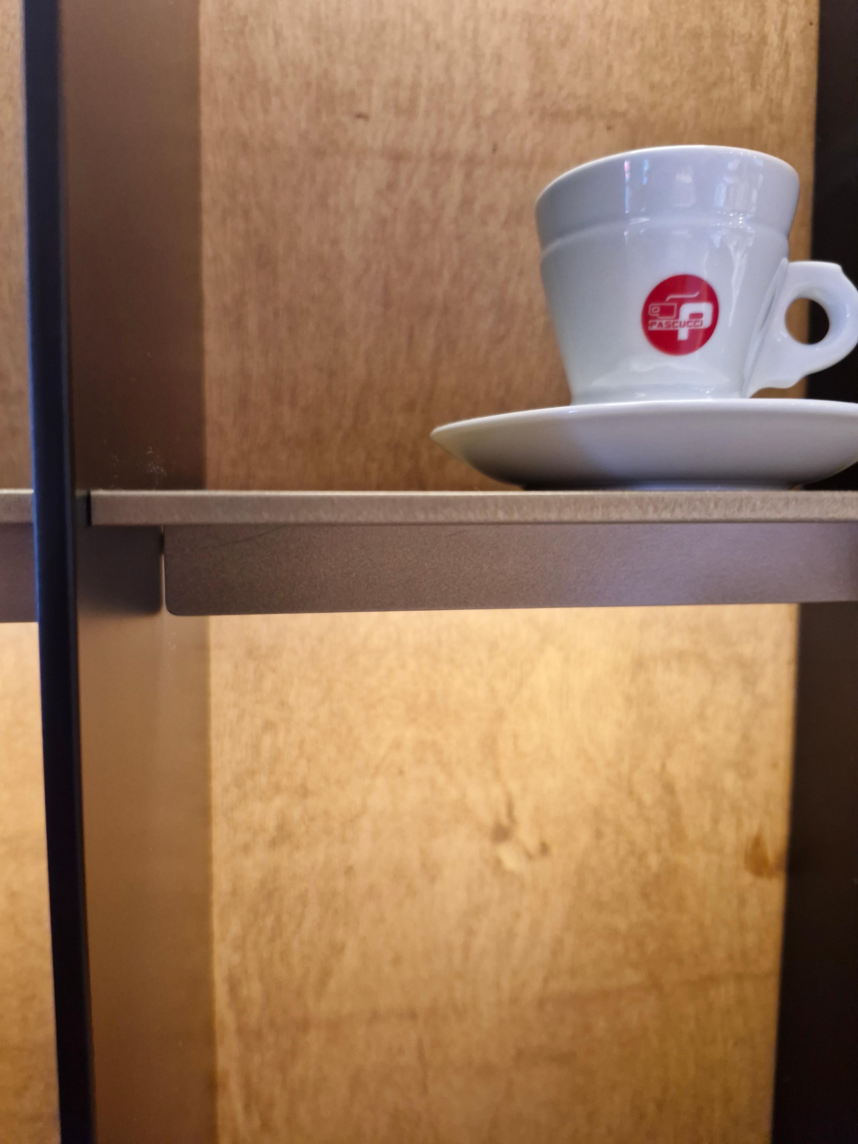 카페 뒤에 있는 장식장에 놓여있는 예쁜 잔.