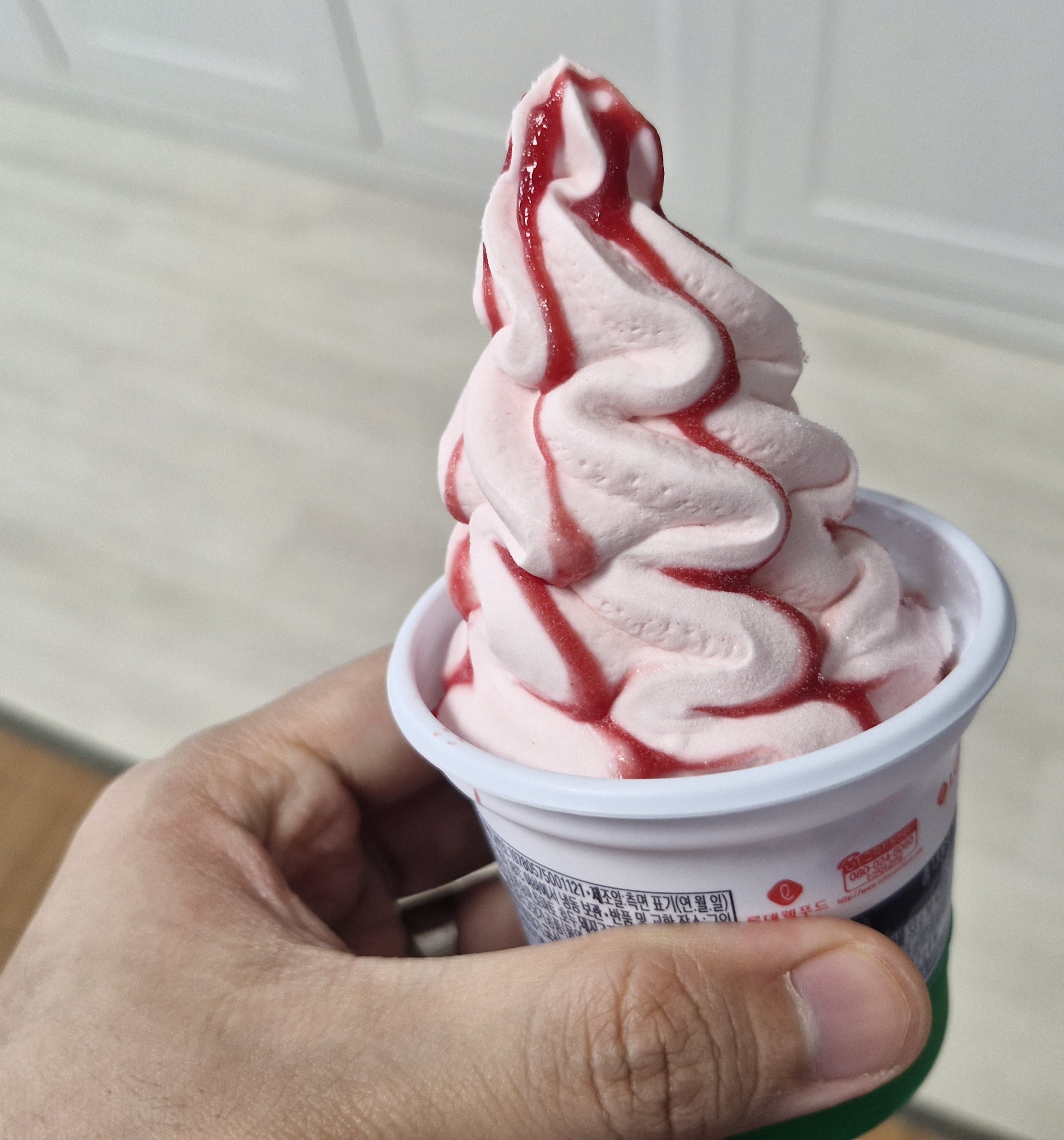 먼저 딸기잼이 뿌려진 아이스크림을 먹는다.