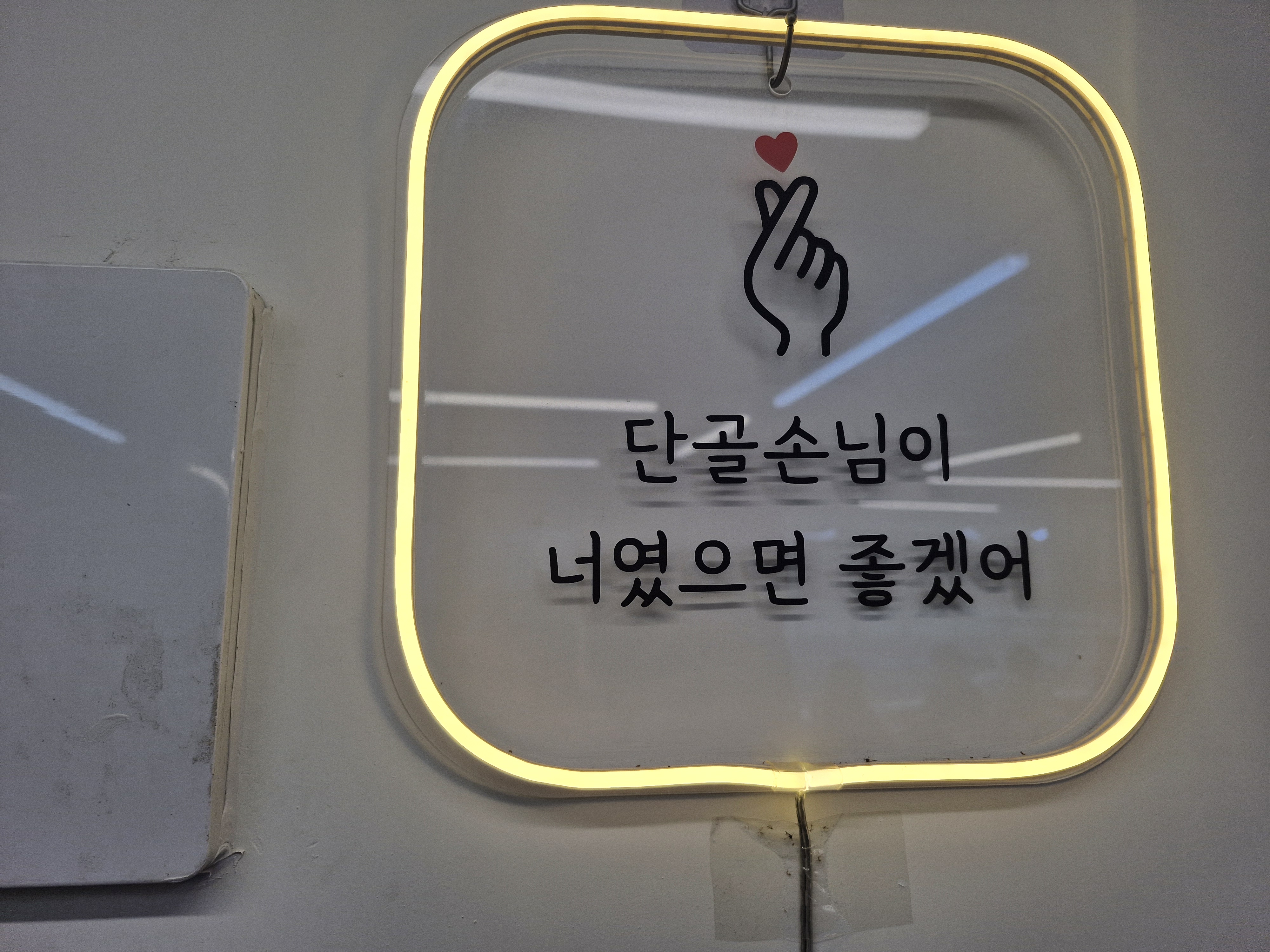 먼저 입구 벽에 손하트 그림과 좋은 문구가 있는 네온사인이 있다.