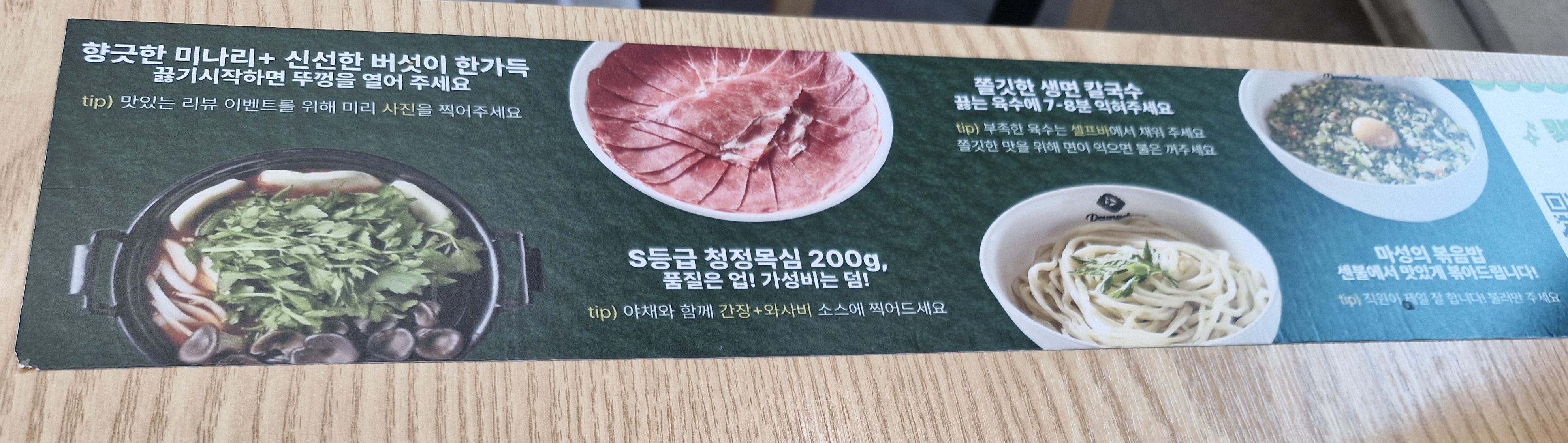 테이블 위 맨 끝부분에 부착된 샤브칼국수를 맛있게 먹는 방법 안내판.