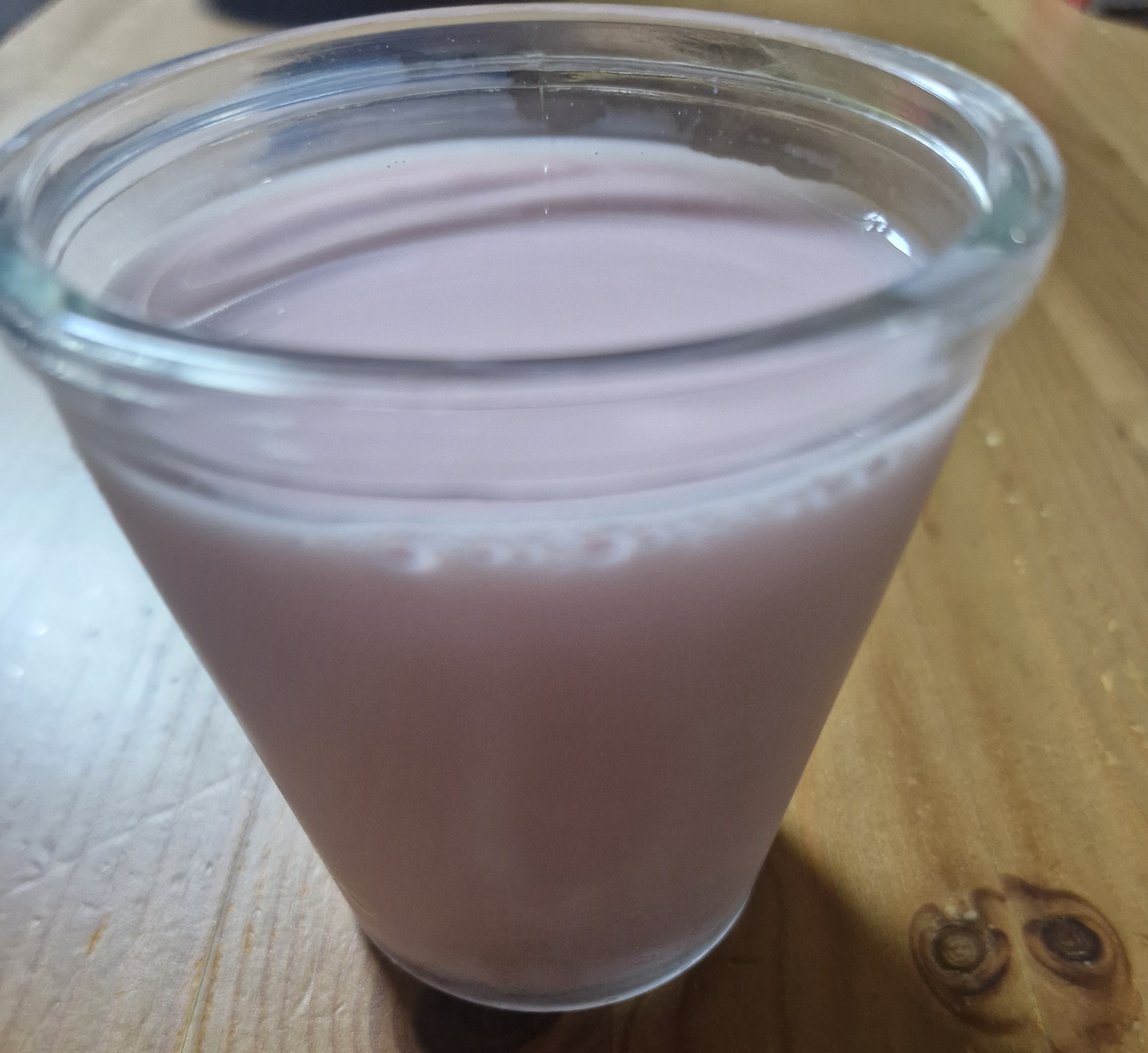 딸기우유를 유리잔에 따라낸 모습인데,