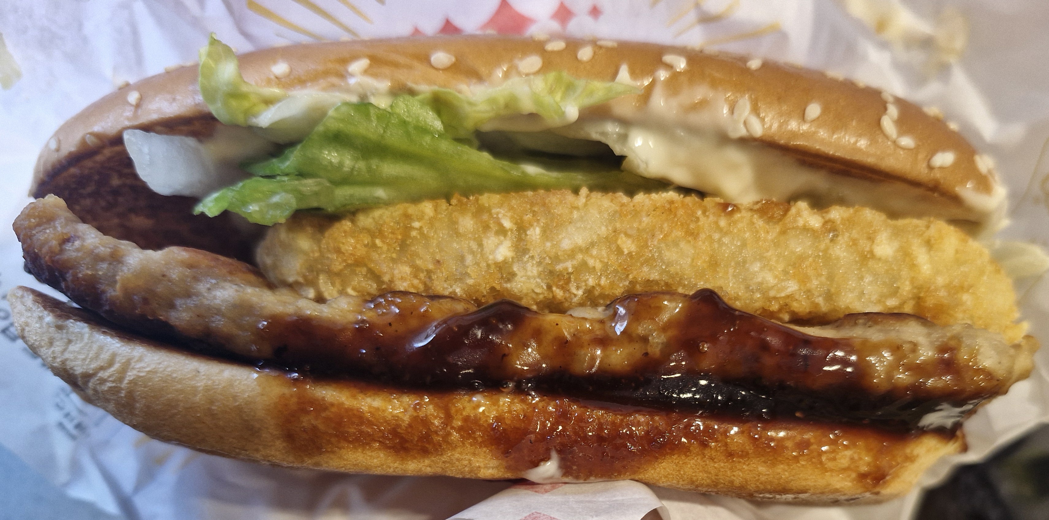 고기패티, 야채, 해쉬브라운이 골고루