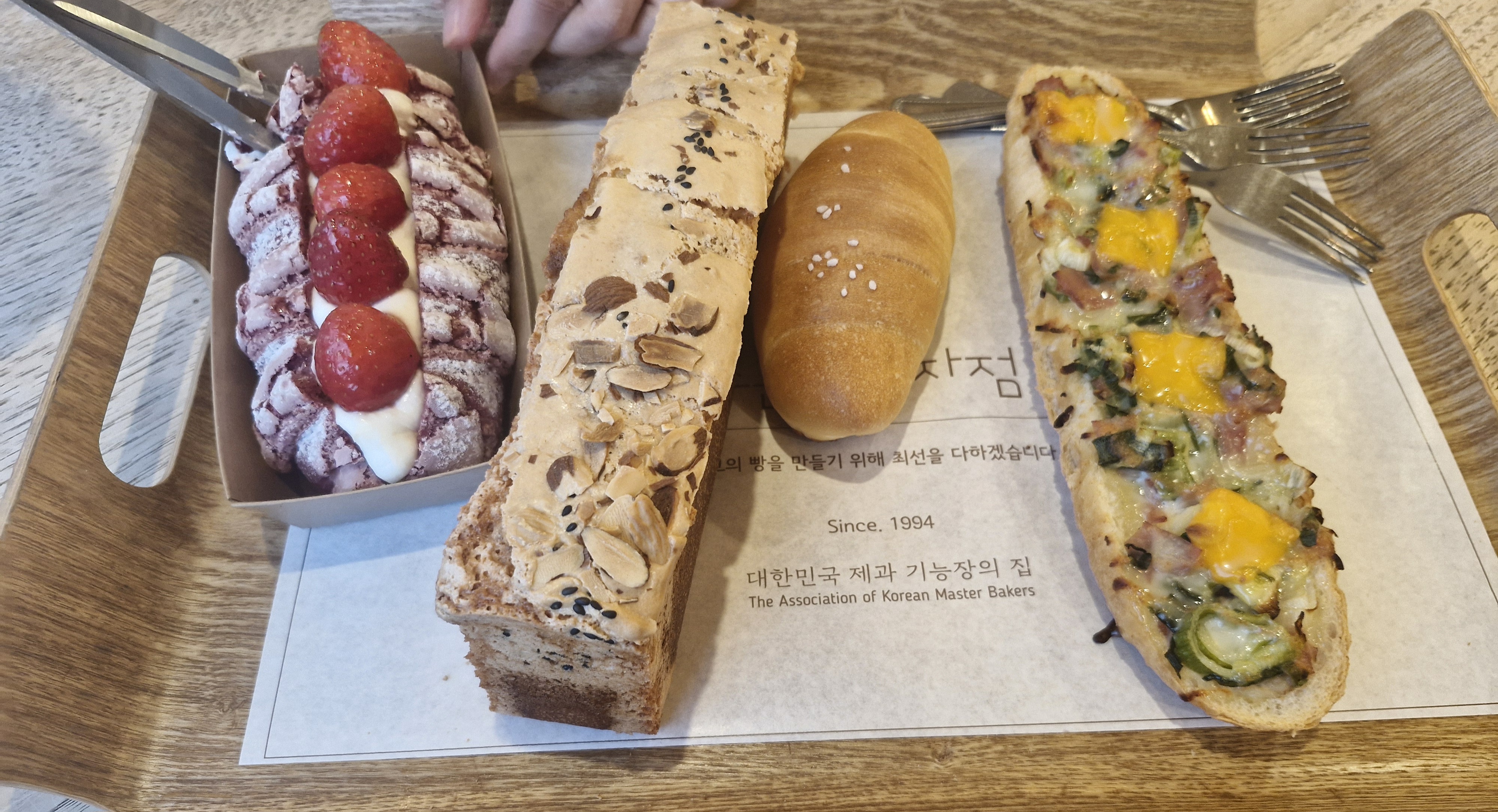 여기서 먹은 딸기 숲, 밤 다쿠아즈마롱, 소금빵, 바게트피자.
