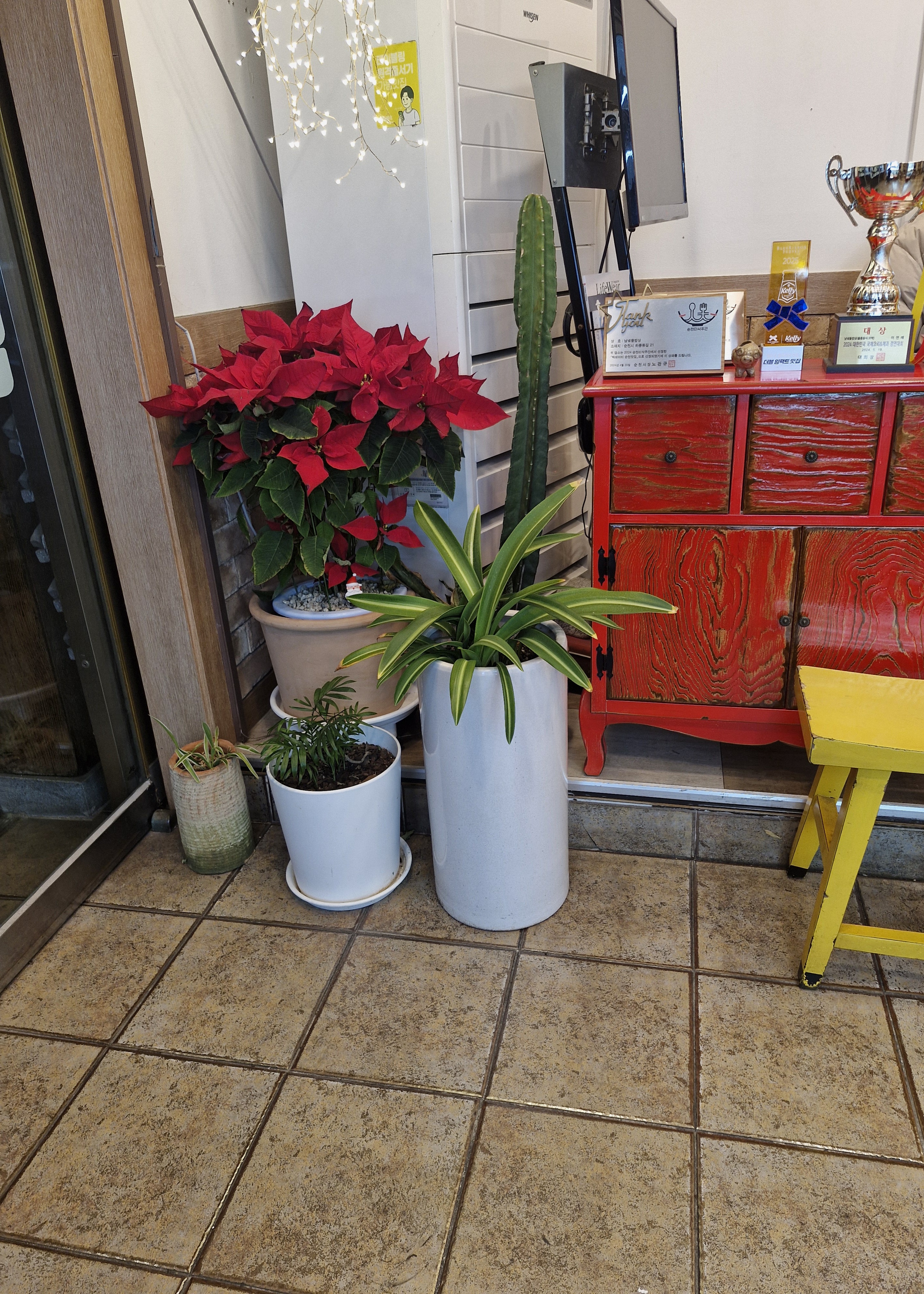 식당 창가에 세워져 있는 크고 예쁜 화분들.