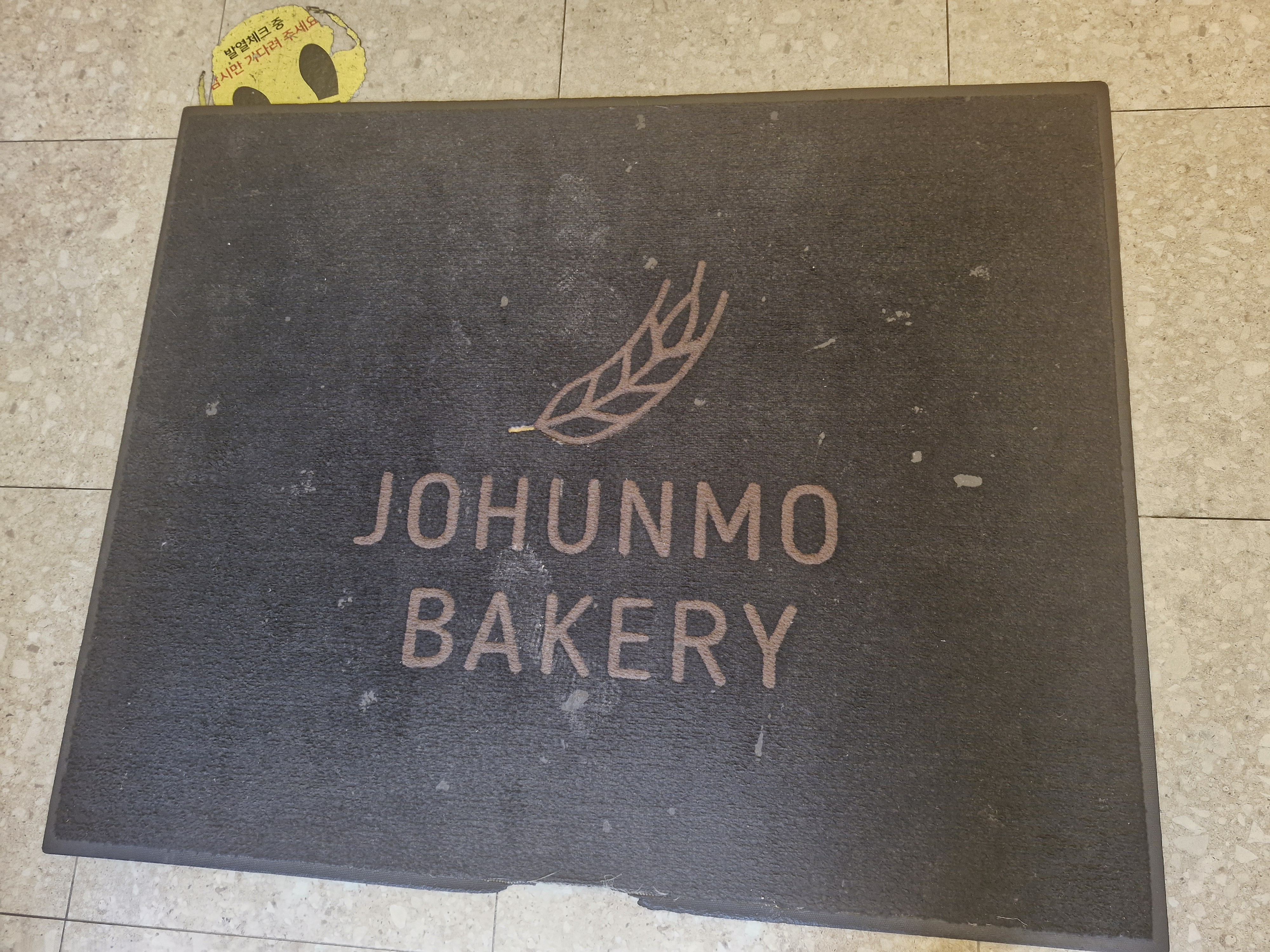 입구 카펫에 "JOHUNMO BAKERY"라는 글자와